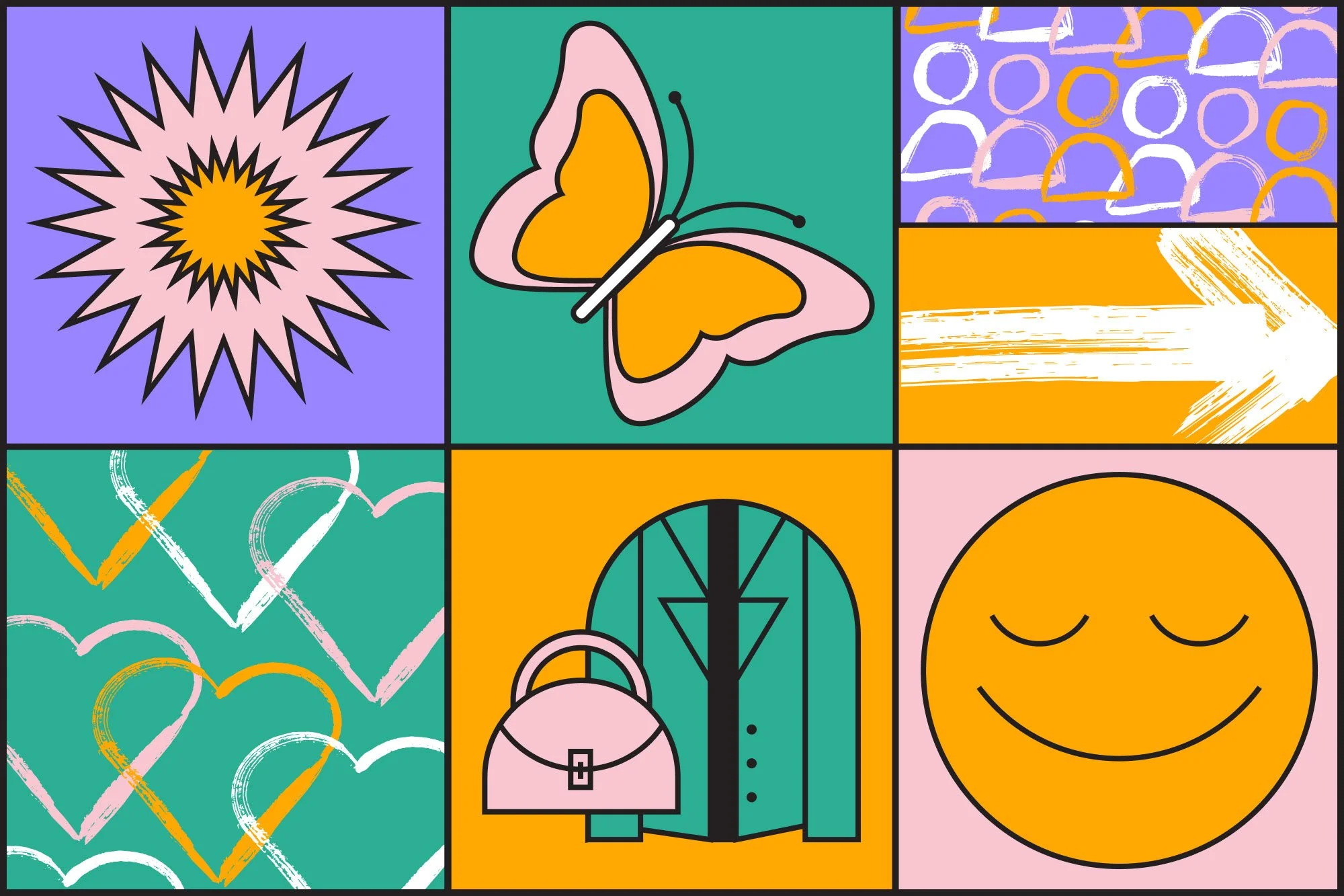 A system of adaptable building blocks, including custom icons, illustration elements, and graphic shapes. We enabled the internal team to generate new layouts and moments while maintaining brand cohesion.
